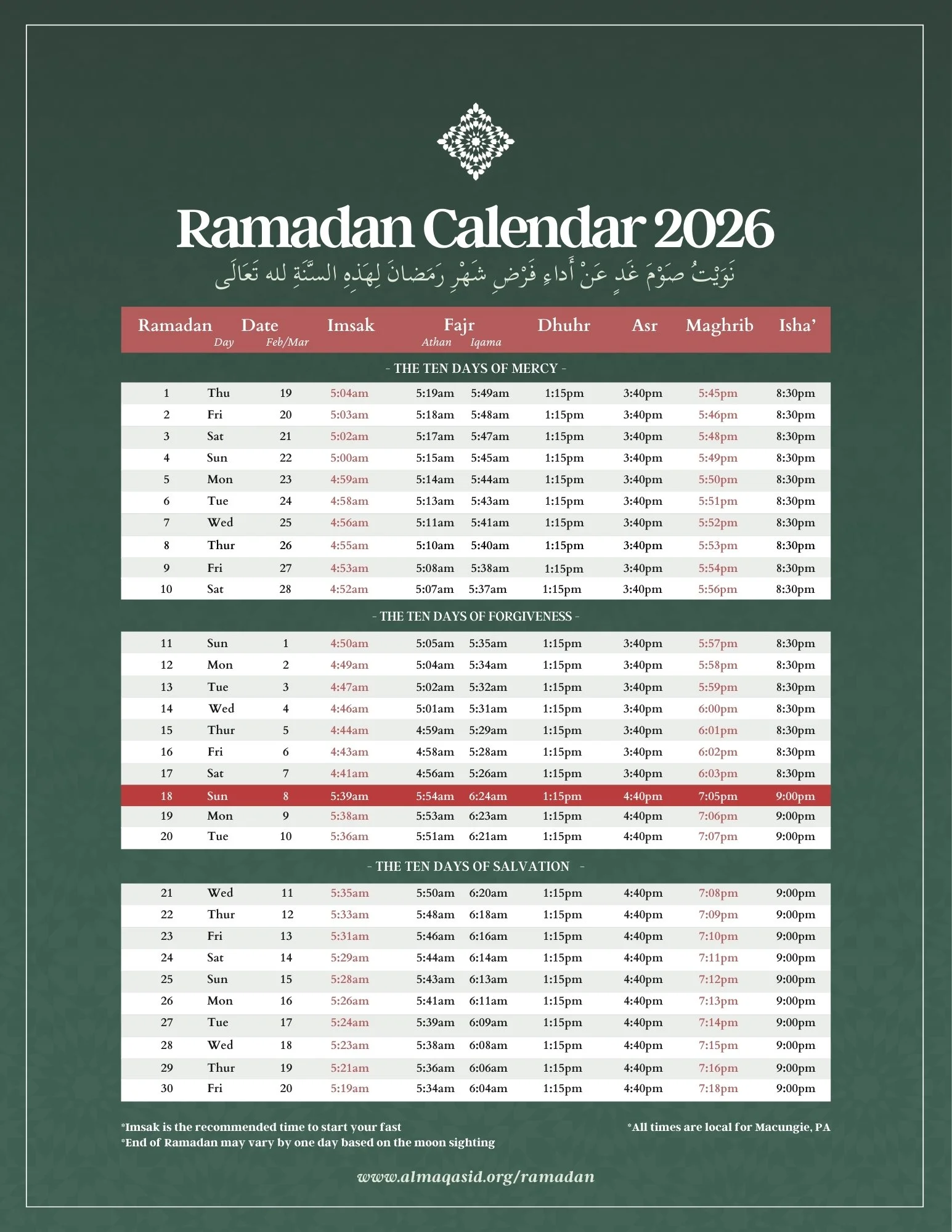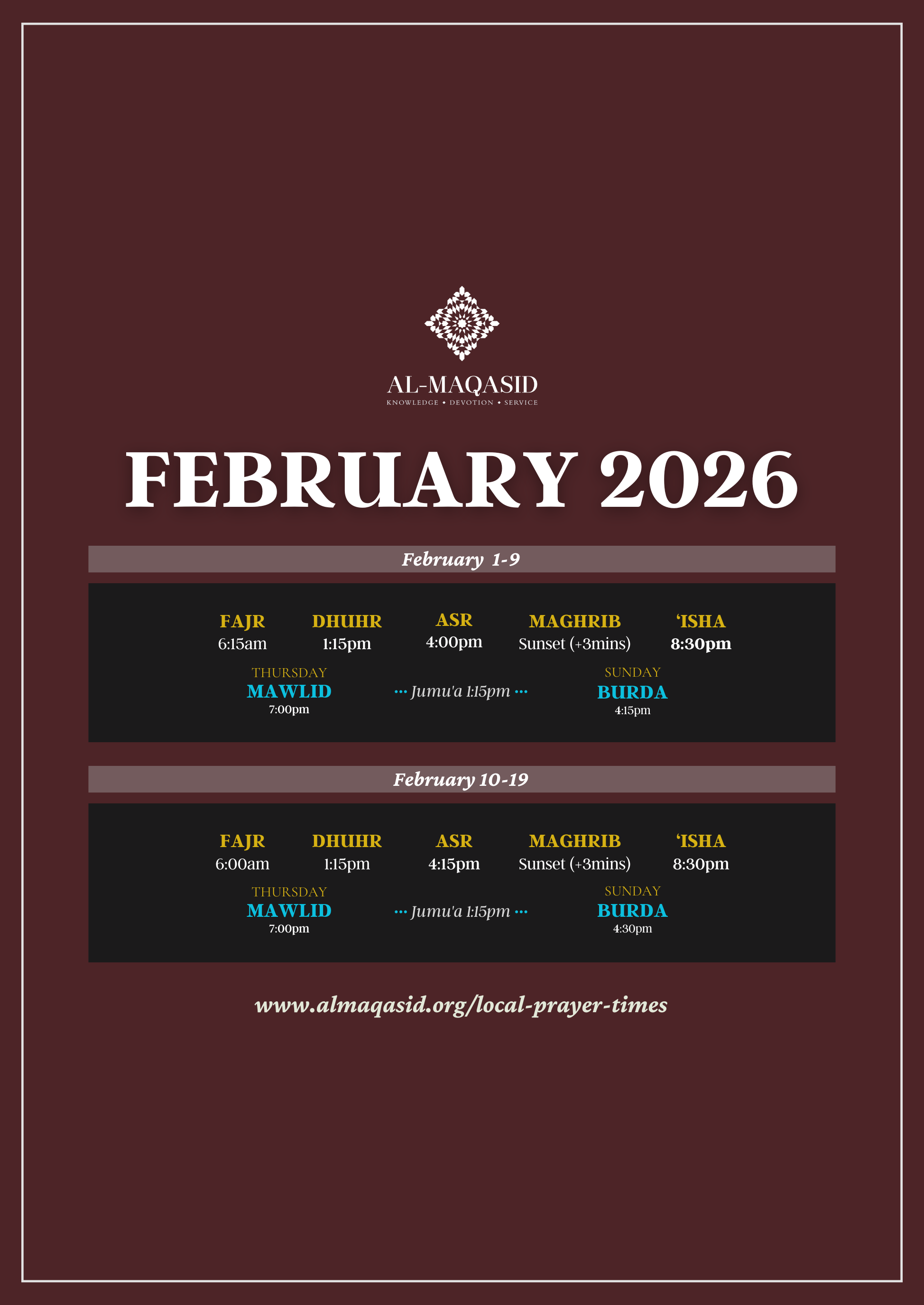 Dates and times for all upcoming Al-Maqasid gatherings, events, retreats, commemorations, or trips can be found on our Programs Calendar.