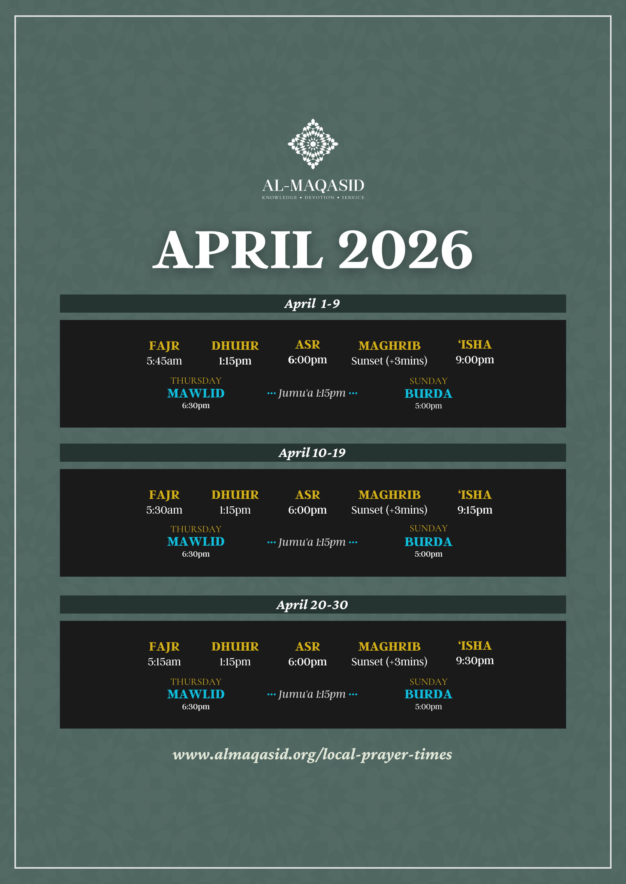 Please find the congregational prayer times below for Al-Maqasid’s Musallā (Muṣallā al-Aṭhār).