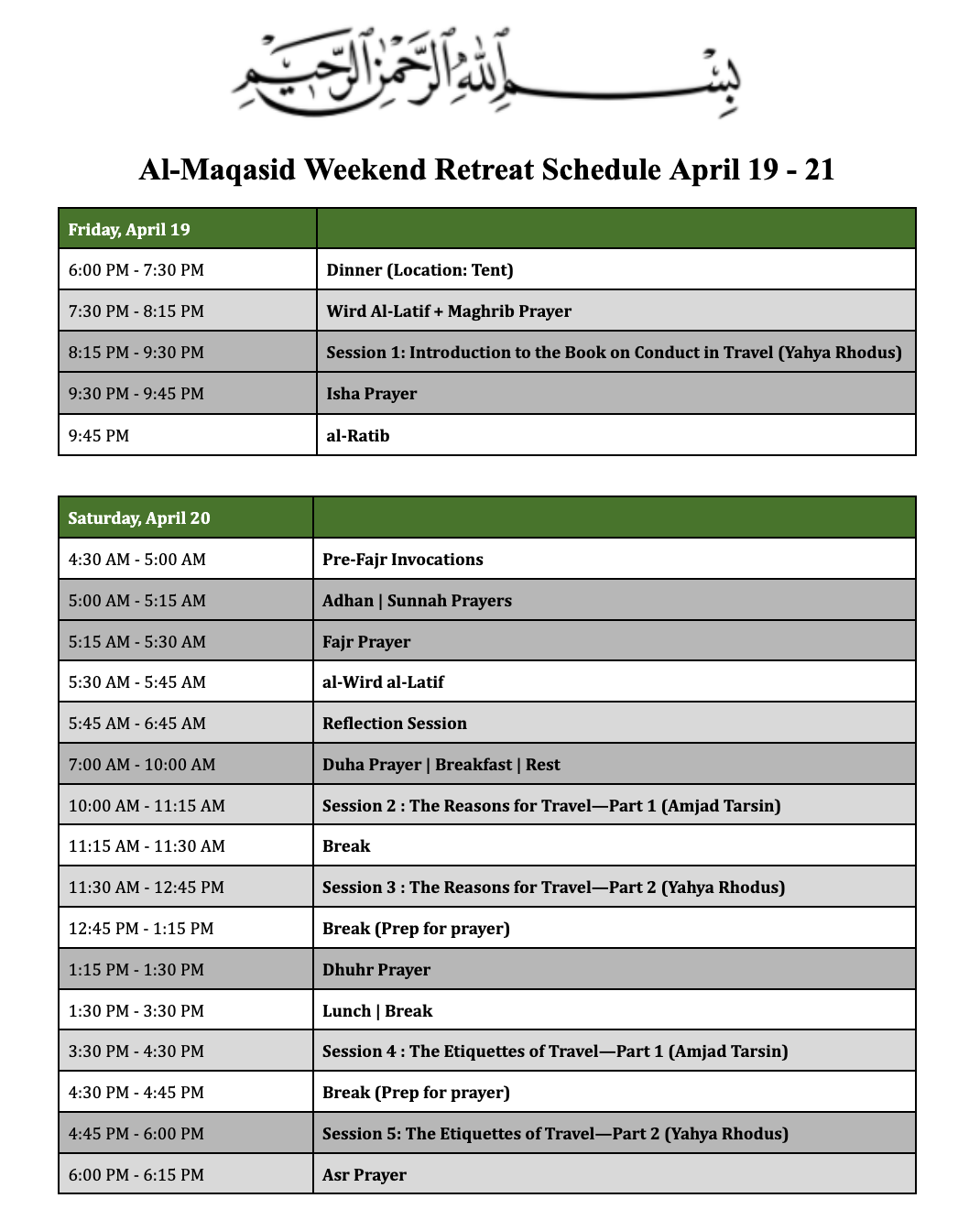 We pray that this message reaches you in the best of states. You have registered to attend the Al-Maqasid Weekend Retreat from Friday evening, April 19th at 5:45pm to Sunday afternoon, April 21st 4:00pm. With Allah’s permission, we will be blessed to be joined by Yahya Rhodus and Amjad Tarsin as well as resident Imam Sayyid Abdul Fattah Ba-Alawi.