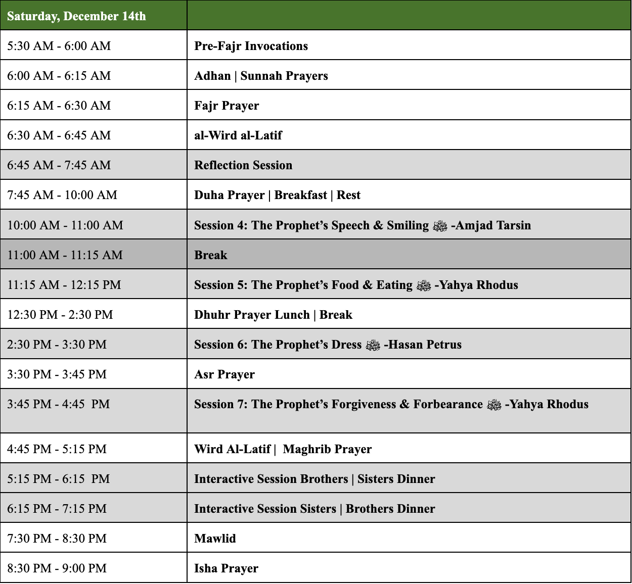 We pray that this message reaches you in the best of states. You have registered to attend the Al-Maqasid Weekend Retreat from Friday evening, December 13th at 5:45pm to Sunday afternoon, December 15th 4:00pm. With Allah’s permission, we will be blessed to be joined by Yahya Rhodus and Amjad Tarsin as well as resident Imam Sayyid Abdul Fattah Ba-Alawi.