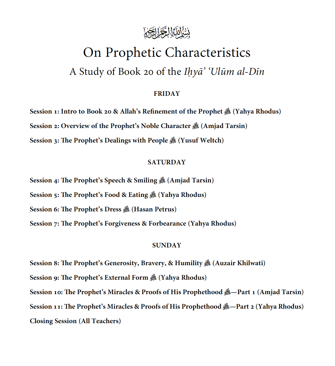 The Topic of the retreat is ‘On Prophetic Characteristics: A Study of Book 20 of the Iḥyā’ ‘Ulūm al-Dīn’. In Imam al-Ghazali’s On Prophetic Characteristics, he gives numerous examples from the life of the Prophet Muhammad ﷻ that illustrate his exemplary manners, his speech and laughter, his etiquette with food, his manner of dress, his courage, his forbearance, his miracles, and much more ﷻ.